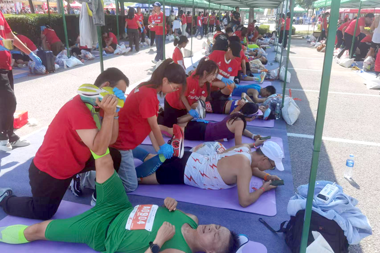 活动期间,志愿者们在半程和全程马拉松终点处,设置赛后保障服务点,为完赛运动员进行下肢肌肉拉伸放松与腿部痉挛肌肉手法治疗。随着参赛选手陆续完成比赛,前来放松治疗的选手们络绎不绝,志愿者们克服炎热和高强度工作困难,始终保持高度热情与专注,用微笑和耐心为每一位运动员提供贴心服务,赢得了广大参赛者的广泛赞誉。